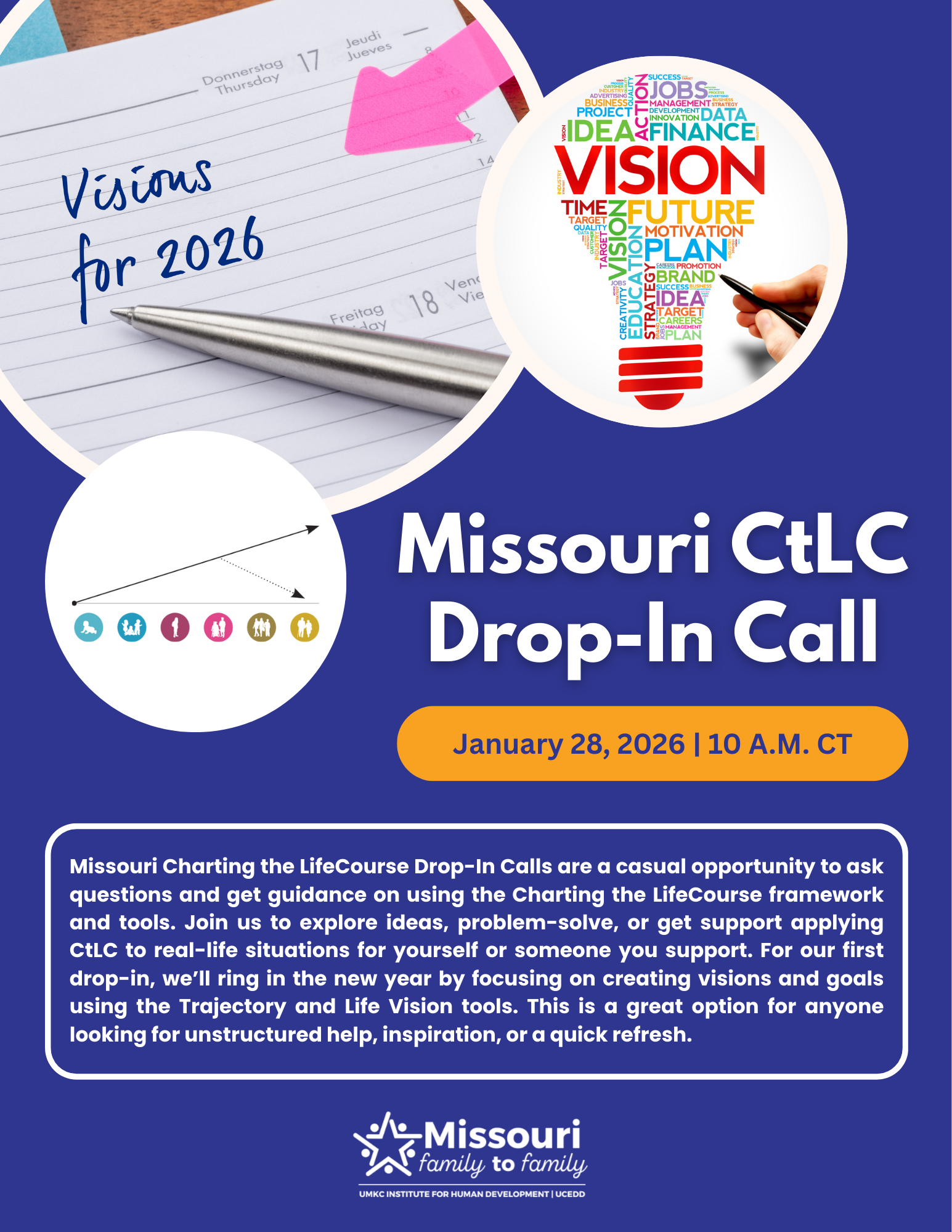 Missouri Charting the LifeCourse Drop-In Calls are a casual opportunity to ask questions and get guidance on using the Charting the LifeCourse framework and tools. Join us to explore ideas, problem-solve, or get support applying CtLC to real-life situations for yourself or someone you support. For our first drop-in, we’ll ring in the new year by focusing on creating visions and goals using the Trajectory and Life Vision tools. This is a great option for anyone looking for unstructured help, inspiration, or a quick refresh.